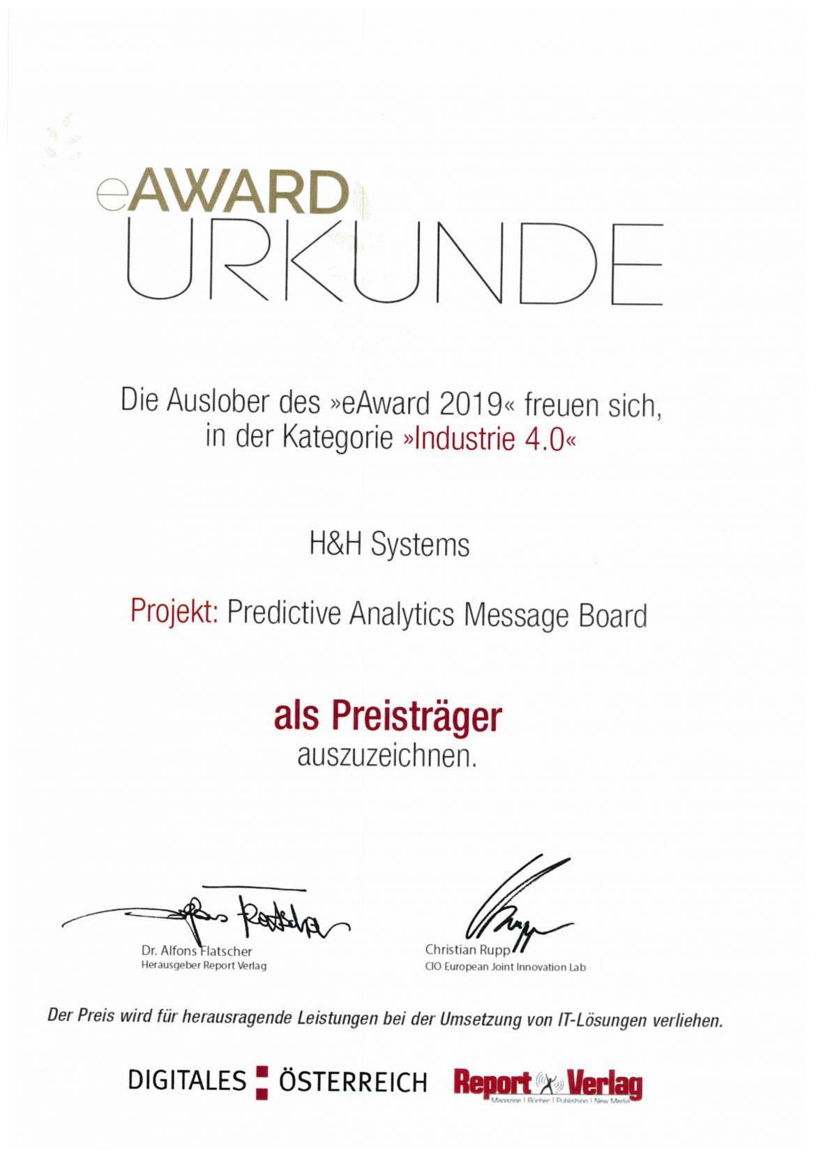 The authority of the "e-Award 2019" is glad to honour, in the category "Industry 4.0" ...